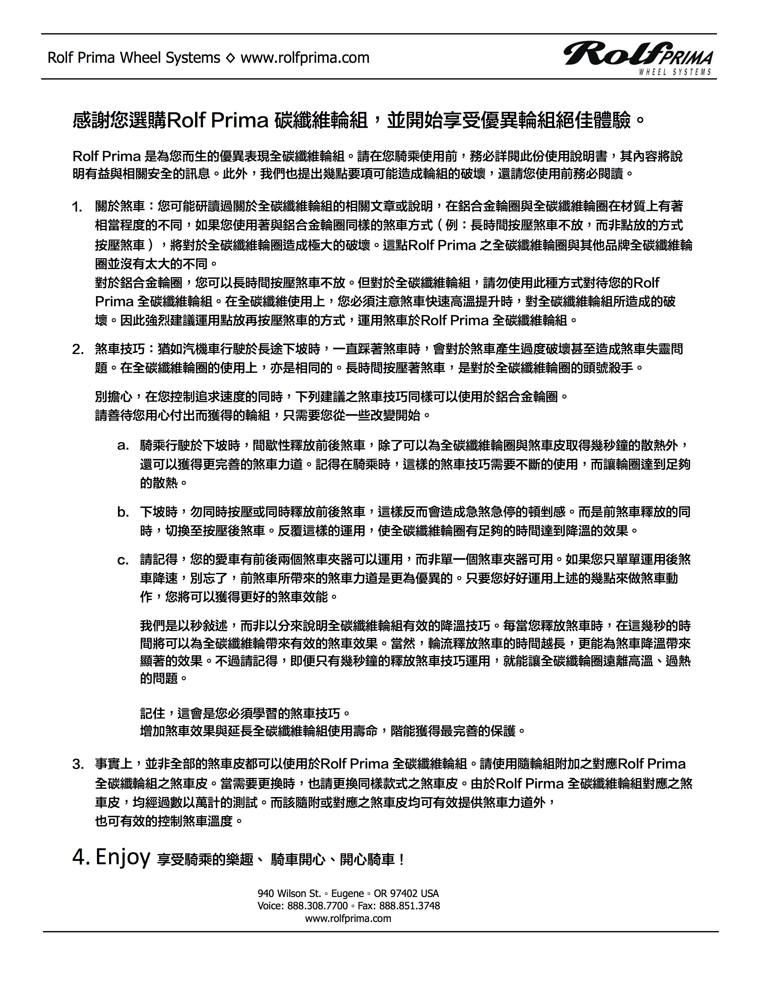 在今年的Eurobike Show,我們與原廠與會的同時。原廠發現接獲許多因為在使用上所造成的客訴問題。有鑑於此,原廠要求全球分據點,將原廠所提供之使用說明翻譯成各國語言版本,並宣傳至各網路平台提供給大家參考。在此建議說明書中,將絕大部份的使用小技巧都說明的清楚。這些小技巧,不單是使用於Rolf Prima 全碳纖維輪組,而是同樣可使用於其他品牌之全碳纖維輪組商品。
